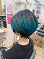 丸みのあるショートスタイルに毛先はブリーチベースにマニパニでカラー!原色系の派手髪にしたい方はマニパニがオススメ!ブリーチのデザインや色味などは当日一緒に決めていきましょう!ご来店お待ちしてます♪