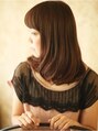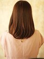 ワンレングスベースでカット。内巻きにキレイに入るようにカットしています。カラーはとても落ち着いた印象を与える8レベルのブラウンベージュに染めています。クセがある方や手触りが気になる方はグロスを。