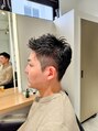 さっぱりと刈り上げトップのみ長さを残しました。はちまわりの膨らみをしっかり取り、タイトに作り上げました。スタイリングはグリースのみの簡単セットです。ズボラな方でも毎日簡単にセットができるショートスタイルです。