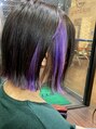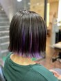 切りっぱなしの外ハネボブをベースにインナーにバイオレットとピンクのミックスカラーを入れた個性的なヘアカラーのスタイル※カラーバターを使用している為、ご持参頂くか一度長山宛にお問い合わせください。