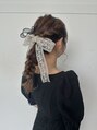 大きなリボンがアクセントのガーリーヘア。ゆるく高めのポニーで可愛さをだし、編み下ろしのふんわり感で華やかさをプラスしました。ふわっと引き出し全体的にボリュームがあるように見えるように作りました