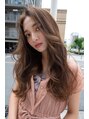 ロングのヨシンモリ風ウェーブスタイル。顔まわりの動きを外に流す事でシルエットの真ん中にボリュームが出る様にカット。全体は重過ぎない程度に毛先を毛量調整して、大きく柔らかなウェーブに♪アーモンドベージュが艶と透明感を出してより可愛く♪