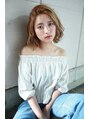 a sideスタイルです。一度ブリーチを使わず明るくした後に淡くベージュカラーを入れて透明感を。毛先は緩く巻いています。