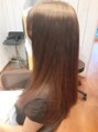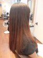 ロングの長さベースに、やや前上がりのレイヤーグラデーションにカットして、縮毛矯正、カラー、超音波トリートメントをして、つややかにまとまりやすくしています。