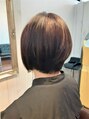 ショートベースの長さに、前下がりグラデーションボブにカットして、質感毛量調整を施して、軽さとまとまりを良くしています。カラーもアッシュ系ブラウンで色を入れて、超音波トリートメントもして潤いを与えて持続性を高めていきます。