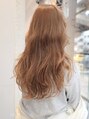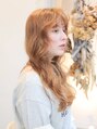 大人ガーリーなオレンジゴールドのくせ毛風ロング。ドライ質感でふわふわとやわらかさを出してフェミニンに。前髪パーマでフレンチカジュアルにイメチェン。顔周りのレイヤーで小顔に仕上げて洗練度アップ。アシンメトリーやセンターパートのヘアアレンジも◎