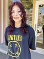 スパイラルパーマのレイヤーカットスタイル。カラーはピンクレッドブラウンに染めていて、鮮やかで濃い深みのある色みに仕上げています。パーマスタイルとの相性抜群なカラーなのでおすすめな組み合わせです!