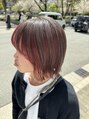 全体をブリーチして、表面はグレーに、中側は紫よりのピンクに染めた、アンブレラカラーです!カットは切りっぱなしで、量は軽めなスタイルで、オイルをつけるだけで簡単にスタイリング出来るスタイルです!