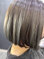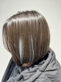 ミニボブに、ポイントでブリーチをして、水色を乗せたスタイル!ブリーチ部分以外はグレージュで赤みのないカラー◯表面にランダムに入れることで、ちょっとした変化を楽しめるスタイルです!