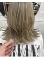 ケアブリーチで全体を明るくして、明るめのグレージュを◯切りっぱなしに全体的にレイヤーを入れて、全体は外ハネにして、表面は内巻きにして、オイルをさらっとつけるだけで動きのあるスタイルに!