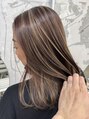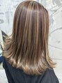全体にケアブリーチでハイライトをいれて、ハイライト以外の部分は少し暗くして、コントラストのついたカラーです!オイルをサラッとつけるだけでも、デザインを感じれるオススメなカラーです!