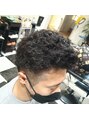 サイドとネープはすっきり高めにツーブロックと刈り上げトップは長すぎずで強めにパーマをし、カールと動きがしっかりあらわれ、カッコよく