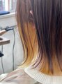 カットでラインを整えた切りっぱなしボブに、イエローのインナーカラーをプラス。ベースの落ち着いたカラーとのコントラストで、動きや耳かけしたときにさりげなく見えるおしゃれなデザインカラーに仕上げました。