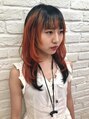 オレンジにブラックのインナーカラー×ウルフカットスタイル。エクステを別で染めているので地毛と一緒に色落ちしていきます。