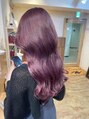 明るすぎないラベンダーピンクカラー♪ブリーチ1回でできるカラーです◎肩ラインのボブからエクステ90枚でロングにしています。地毛とエクステが一緒に色落ちしていくようにエクステも別で染めてから付けてます◎