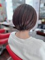浮きやすいえりあしをおさまりやすくカット。やや軽めのマッシュショート。しっかりした髪質の方でも柔らかい感じにフワッと。白髪染めは使わずやわらかいベージュで春先取り。