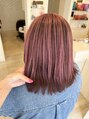 アンブレラカラーです!表面だけブリーチをして全体的にピンクカラーを重ねています♪レイヤーカットしてるので重たく見えずらいところもポイント☆分け目の白髪ぼかしにもなるので、大人女性のお客様にもオススメです☆