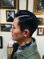 トップとサイド、バックのコントラストをつけず厚めに刈り上げる事で自然な仕上がりに、全体をタイトに抑えた7.3スタイル。よりクラシックスタイルにする為にフロントに高さを出したポンプスタイルもオススメです。