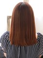 前髪長めのナチュラルなストレート。 ライトオレンジベージュで透け感とツヤ感をプラスしてクールになりがちなストレートスタイルからチェンジ!! センターパートでセクシーさと清潔感のある仕上がりに。{町田東口.町田駅}