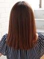 前髪長めのナチュラルなストレート。 ライトオレンジベージュで透け感とツヤ感をプラスしてクールになりがちなストレートスタイルからチェンジ!! センターパートでセクシーさと清潔感のある仕上がりに。{町田東口.町田駅}