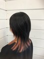 お顔周りはマッシュにカット表面の癖が強いところは縮毛矯正をしボリュームを抑え、内側はブリーチで1度色を抜いてインナカラーをしています。地毛の黒を生かしサーモンピンクが引き立つカラーになっています。