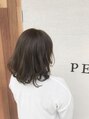 カラーは柔らかいグレイベージュ系のカラーです。カットでは重く見えにくいように質感と量感の調整でスタイリング時に透け感が出るように調整しています。