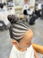 タイトに編み込んだコーンロウをトップでまとめたインパクト抜群のデザイン。ラインを美しく見せる精密な編み目と立体的なお団子で、ダンスやイベントにも映える存在感のあるブレイズスタイルです。