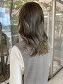 ミディアムの切りっぱなしにオリーブカラー☆グリーン感を多めにして赤みを消しつつくすみすぎないように◎顔まわりも作って巻きやすく小顔効果に♪