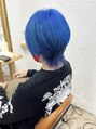 ブリーチリタッチでつなぎながらブルーをオン。カットはややえりあしを残したサイトグラのスタイル。ストレートアイロンとオイル、スプレーでキープ。
