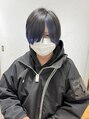 カットはマッシュウルフベースのスタイルに顔まわりは引き締め効果を狙い斜め気味のアーチバングにカット。カラーの見え方を考え、バックのウェイト(膨らみ)は耳の位置に設定。カラーは2ブリーチベースのブルー。アウターはディープシルバー。