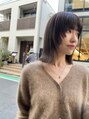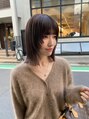 全体は肩にギリギリつく長さに。あえて全体の毛先と顔まわりにパツっとラインをだしたウルフボブ。カラーはモカグレージュ。