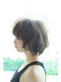 リップラインのショートボブです。トップは根元中心に、それ以外には毛先中心にパーマをかけバランスのよいひし形シルエット。小顔効果にきたいできます。