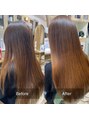 リタッチ矯正から毛先にかけてダメージはトリートメントで補強しかけたての時の艶感を戻します!しっかりストレートに出来ていれば何度も矯正しなくても綺麗に出来ますよ!