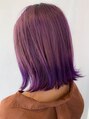 トリプルカラーが必要です!1.ブリーチで全体を16LVまで明るくします。2.バイオレットが入りやすいように、明るめのグレー系のカラーを入れます。3.上からバイオレットの色を入れて、毛先は濃いめの色を乗せてアクセントを付けます。