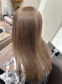 柔らかくて上品な印象のミルクティーベージュ。赤みを抑えて、ツヤと透明感を最大限に引き出しました。ブリーチ毛でも髪質改善を組み合わせることで、見た目も手触りもツルツルに◎暗くても明るくても似合わせ可能な万能カラーです