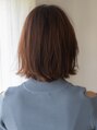 ボブスタイルの表面にレイヤーを入れています。毛先を外ハネにしてレイヤーをうちに入れることでひし形のシルエットができます。表面を少し引き出すことで緩い感じを出しています。前髪は程よい薄さにすることで重すぎない印象に仕上げています。