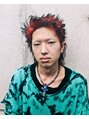 《カット》前髪短めのウルフスタイル。《カラー》ブリーチ→ビビッドカラー→毛先カラーダブルカラーでブリーチ後にレッドをオン。さらに毛先のみ黒を入れ個性的なパンクテイストなヘアに。