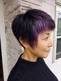カットはショートで耳にかけられる長さ、襟足の長さ短め、横から見たシルエットを大事に!サイドは耳にかけ、前髪はスッキリ短めで横に自然に流す。カラーは白髪を生かしパープル系で渋くカッコイイ感じにヘアスタイルにマッチしてます!