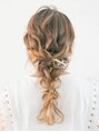 編みおろしカジュアルアレンジヘア。ピンを使わず、ゴムだけで作れる簡単ヘアアレンジ。後れ毛を細かく出し、巻いて抜け感をだすことでこなれた印象に。【EARTH●●店】