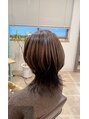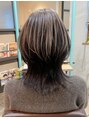 顎下あたりにくびれをつくった、ミディアムレイヤースタイルです。顔周りにもたっぷりレイヤーを入れて、小顔効果大です!トップだけに傘状にハイライトをいれる、アンブレラカラーも施しました。白髪ボカシ効果とデザイン効果両立できます。