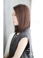 髪を暗めのダークグレージュカラーでツヤ感を強調させた、ミディアムのストレートスタイルです。顔周りはレイヤーを入れて顔を包みこむように切ることで小顔に見せ、また、毛先を少し重めにして、乾かすだけで簡単にまとまるヘアスタイルにしています。