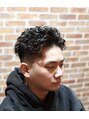 <理容室><バーバー>周りはスキンフェードでスッキリさせ上はバックにパーマをかけて動きが出るように作りました。