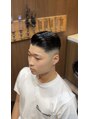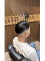 <理容><バーバー>クラシックなパートスタイル。周りはスキンフェードでしっかりと艶のある整髪料でビタっと整髪し漢らしくクラシックな印象になるように。