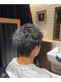 サイドバックはナチュラルなツーブロックで軽さを出して、トップはスパイラルパーマでしっかりと動きをつけました。ナチュラルに仕上げるなら、ワックスでパーマ感をしっかり出すなら、グリースで仕上げるのをおすすめします。