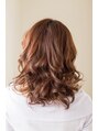 しっとりカールのパーマスタイルです。顔回りの内巻きが女性らしい印象を与えます。カラーはオレンジベージュで艶とうるおいを♪