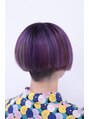 ブリーチ後にバイオレットを根元暗め毛先明るめのグラデーションを作ってから全体に橙、赤紫、黄、ピンク、紫のマニックパニックを筋でON!!!秋を感じるユニコーンスタイルで落ち着いた中に遊びがあります!カットはサイドからネープを刈り前下がりボブ!!!!