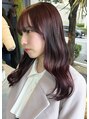 一見暗いブラウンカラーの様ですが光に当たると透け感のチェリーレッドなカラーが発光するスタイルに仕上げました。赤とブラウンなのでツヤ感がとても出ますので巻いてもストレートでも可愛い感じになるオススメのスタイルです。