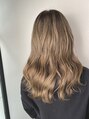ナチュラルトーンのミルクティベージュのセミロングスタイルです。ハイトーン過ぎないナチュラルなミルクティベージュは肌馴染み抜群です。根元を暗めにしているのでリタッチラインが気にならないのも嬉しい!履歴にはよりますが、ブリーチ1回で出来ます。