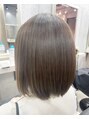 細かめのハイライトをたっぷり入れて、透明感のあるグレージュカラーをのせました。切りっぱなしボブから伸ばしかけなので、軽さを出して伸ばしやすくしています。