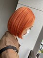 全体をブリーチで脱色し、上からビビッドオレンジのカラー剤をのせました。カットは流行りのミニボブにフェイスレイヤーを入れました。オレンジに飽きて、他のカラーに変えてもかっこいいスタイルなので一時期の派手カラーにいかがですか☆